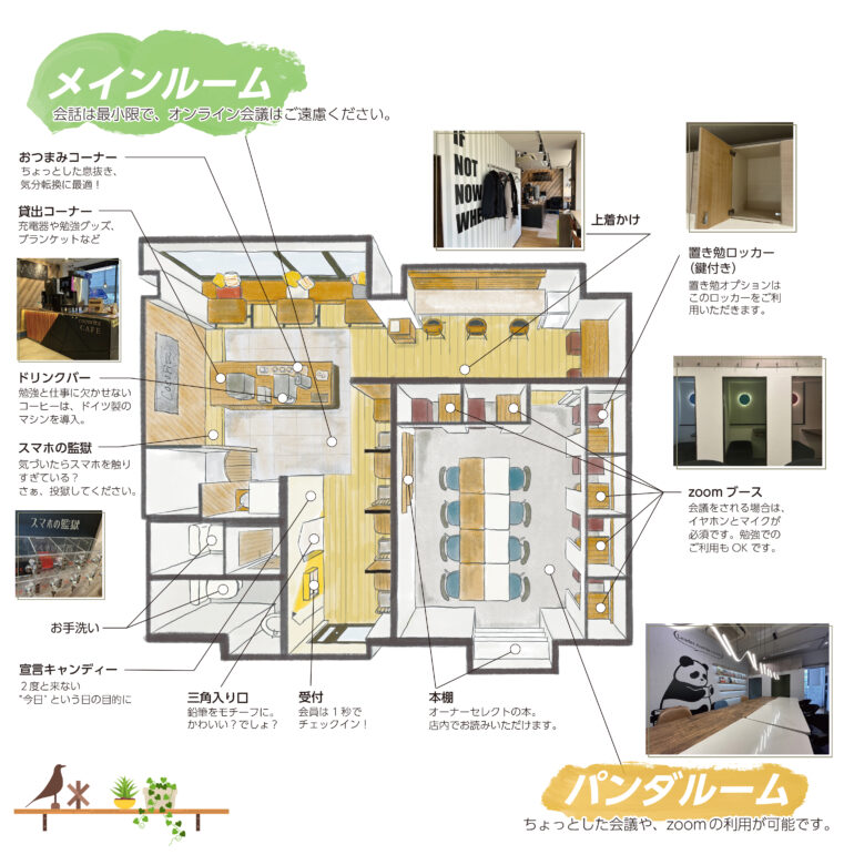 気分や目的によってエリアを選べるカフェ&コワーキングスペースです。
